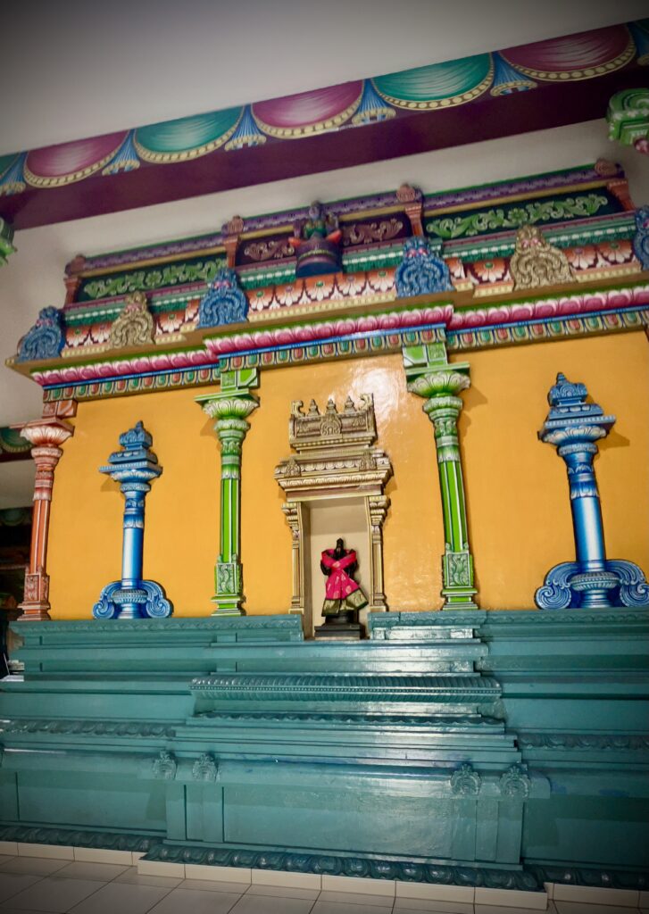 Nachdem wir unsere Schuhe vor dem Tempel ausgezogen hatten, ging unsere Entdeckungsreise im Tempel weiter. Wir erfuhren viel über die einzelnen Gottheiten und wussten anschließend auch, weshalb die Gottheiten ausnahmsweise nicht in ihren Schreinen (Häuschen) standen, sondern zusammen in einem separaten Raum untergebracht waren. Der Tempel wird zur Zeit renoviert und auch die Schreine werden für die Gottheiten „schick“ gemacht.